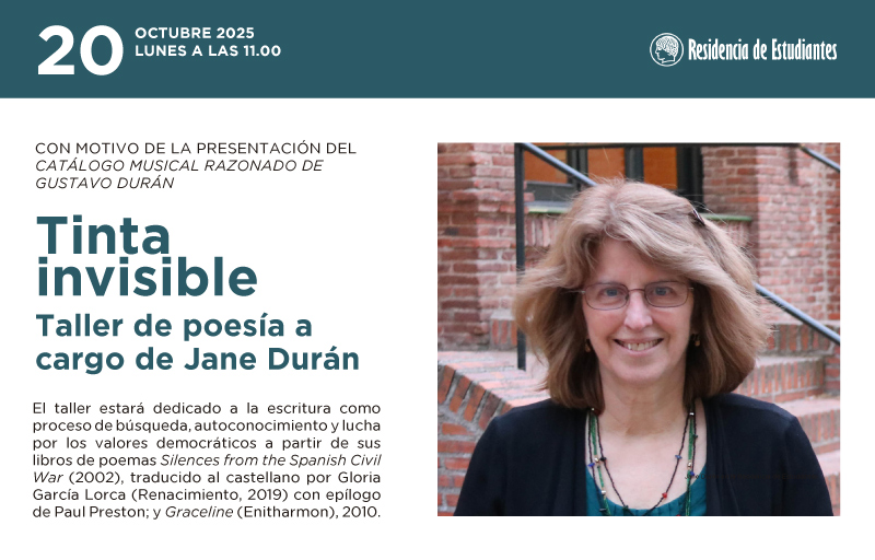 Con motivo de la presentación del catálogo musical razonado de Gustavo Durán, señalamos el Taller de Poesía «Tinta Invisible» a cargo de Jane Durán. El taller se llevará a cabo el próximo 20 de octubre en la Residencia de Estudiantes. Para mayor información y detalle consultar el programa adjunto.