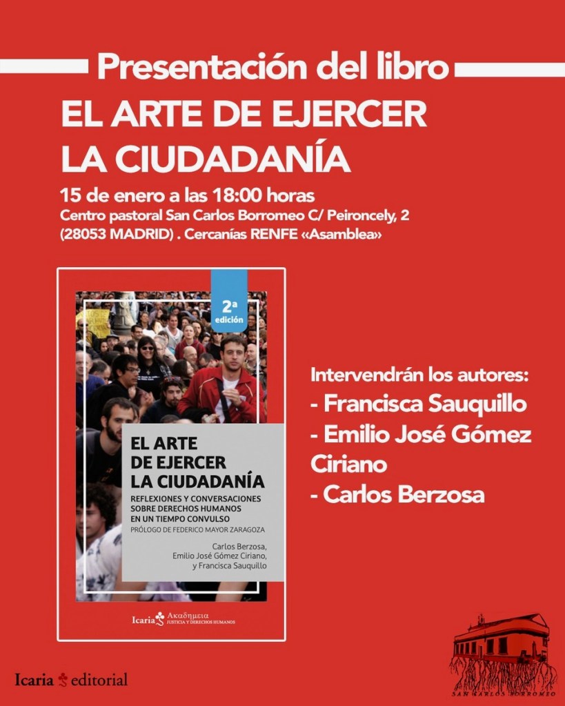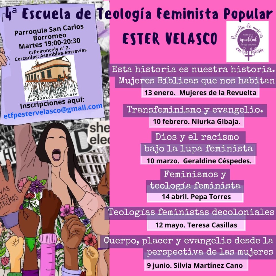 El Centro Parroquial San Carlos Borromeo nos ofrece dos actividades de corte humanístico, muy apreciables en estos tiempos que nos toca vivir. Las propuestas y aportaciones de las personas con salud mental y espiritual son siempre bien recibidas en estos tiempos. Señalamos La Escuela de Teología Feminista Popular Ester Velasco y la presentación del libro «El arte de ejercer la Ciudadanía», con la intervención de Francisca Sauquillo. Para mayor información y detalle consultar los programas adjuntos.