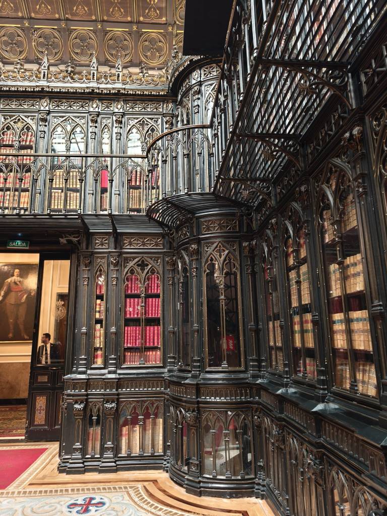 La Biblioteca es la joya del Senado. Impactante por sus trazas, riqueza bibliográfica y belleza arquitectónica, que apoyan sus balconadas y sus escaleras escondidas entre las esquinas del espacio, destacando un virtuoso facistol que ennoblece el recinto. Su Fondo Histórico está considerado uno de los más valiosos entre los legados bibliográficos españoles. Cuenta con mas de 46 mil volúmenes y cerca 160 mil ejemplares, si se incluyen revistas y publicaciones oficiales históricas. Entre 1972-74 se implementó su primer catalogo automatizado. Ahora es protagonista su proyecto de digitalización. El núcleo central de los fondos es la biblioteca del Infante Carlos María Isidro de Borbón, integrada por mas de 11 mil volúmenes, incluidos algunos incunables. (Fotografías de Tuchy Regueras)