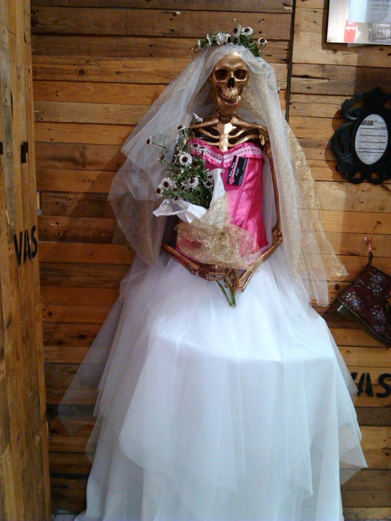 Parece ser que estas novias muertas, muy muertas y engalanadas de vida y color, fue una creación de José Guadalupe Posada. Su origen fue de caricatura y Diego Rivera le endosó su nombre ya eterno: La Catrina. El binomio vida y muerte queda ya para la posteridad y como símbolo de la peculiar visión que tiene , sobre todo, el pueblo mexicano sobre la muerte y sus leyendas, cromatismos e interpretaciones. «La Catrina», esta consolidada como un símbolo de la dualidad vida-muerte. Ya estamos en fechas y resulta fácil cruzarse con catrinas por cualquier avenida o rincón. Esta la encontré en un emplazamiento comercial en un paseo madrileño.