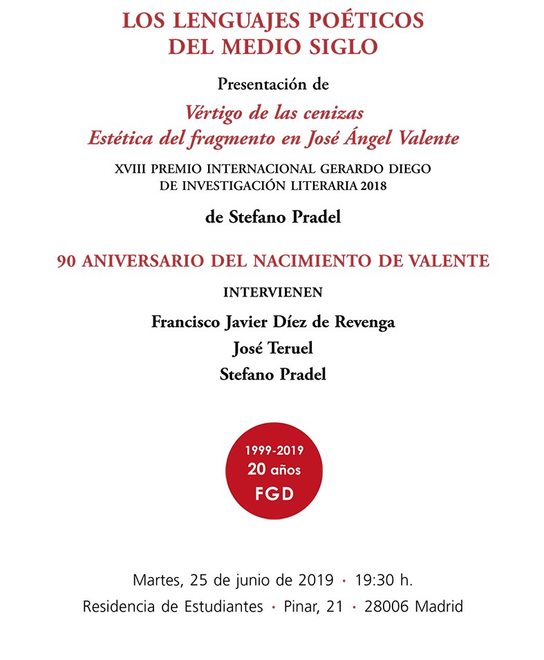 La Fundación Gerardo Diego presenta Vértigo de las cenizas/Estética del fragmento en José Ángel Valente, Premio Internacional Gerardo Diego de Investigación Literaria 2018 de Stefano Pradel. Para mayor información consultar datos del programa adjunto.