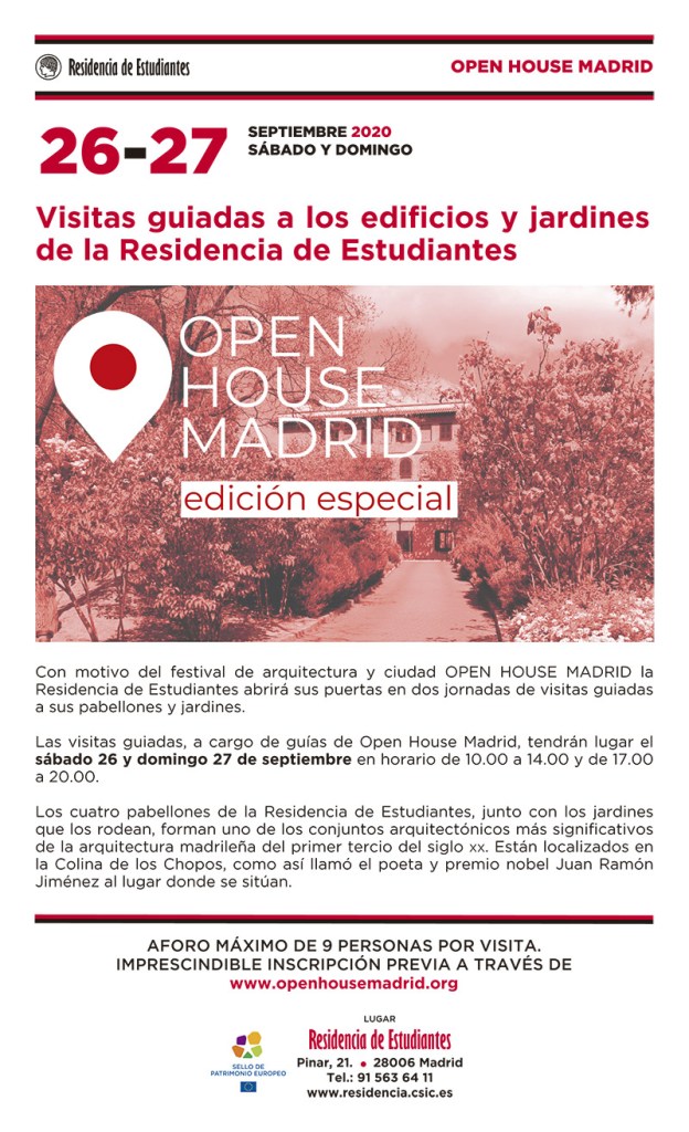 En principio y, si la epidemia no lo impide, reseñamos la posibilidad de llevar a cabo una Visita Guiada a los edificios y jardines de la Residencia de Estudiantes, los días 26 y 27 de este mes de septiembre, dentro la la edición especial de Open House Madrid. Toda la información precisa aparece en el cartel que acompañamos sobre el evento.