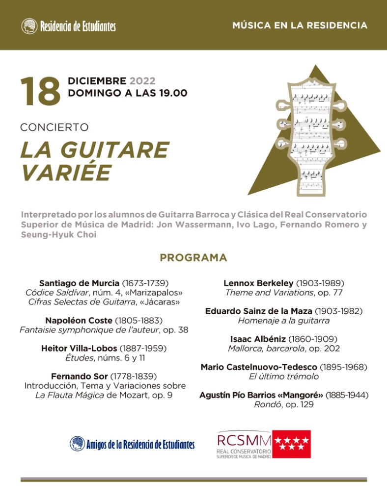 Nos hacemos eco del concierto : La guitare Variée que se celebrará en la Residencia de Estudiantes el próximo 18 de diciembre, interpretado por los alumnos de Guitarra Barroca y Clásica del Real Conservatorio Superior de Música de Madrid. Para mayor información y detalles consultar el programa adjunto.