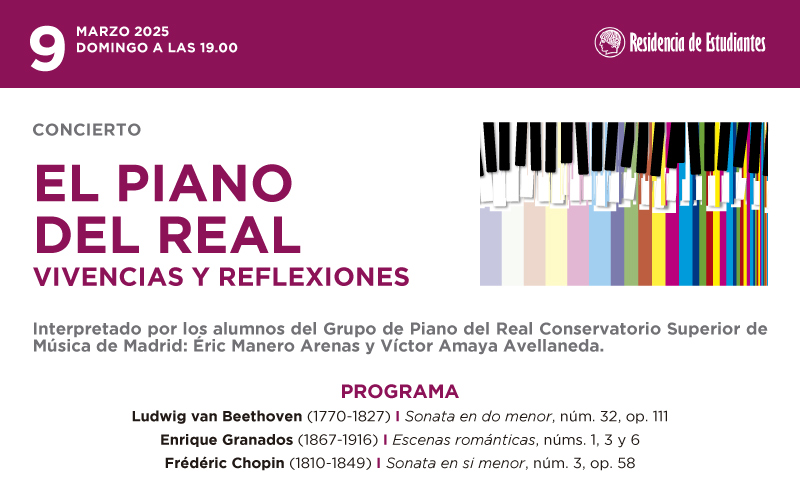 El próximo nueve de marzo, la Residencia de Estudiantes presentará el concierto «El Piano del Real – Vivencias y Reflexiones», interpretado por los alumnos del Grupo de Piano del Real Conservatorio Superior de Música de Madrid. Para mayor información y detalle consultar el programa adjunto.